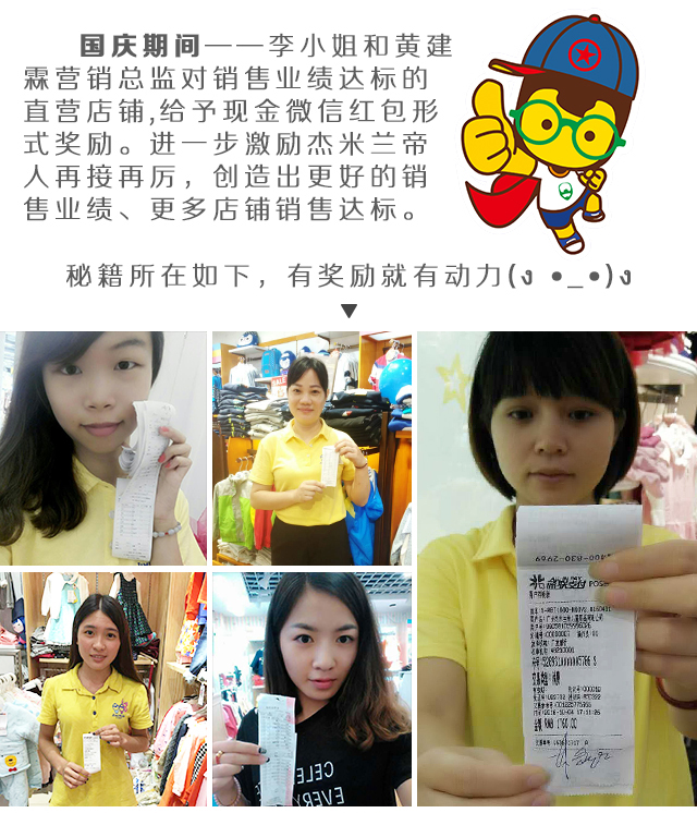 一、銷售奇跡背后,誰是幕后英雄?離不開杰米蘭帝家人的辛苦付出,面對一天滾滾人流,秋冬銷售搶購浪潮,前端導購以一對三,一對四,快速準確搭配,精準服務VIP,也常常因為太忙,顧不上吃飯,加班加點不停不歇,甚至開啟VIP送貨上門等服務。他們用激情和汗水辛苦鑄就的前端銷售奇跡,我們不會忘記。與此同時,李小姐和黃建霖營銷總監(jiān)給予達成銷售業(yè)績的店鋪以現(xiàn)金微信紅包形式獎勵和店員更多的福利獎勵,關愛員工成長是公司的一貫立場。在此,對她們在國慶期間的銷售工作中所付出的努力表示感謝。